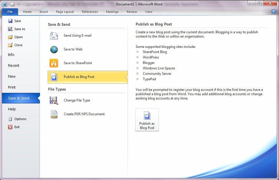 Blogへポストするときは、Fileタブ>Save&Send>Publish as a Blog Postの順でできます。