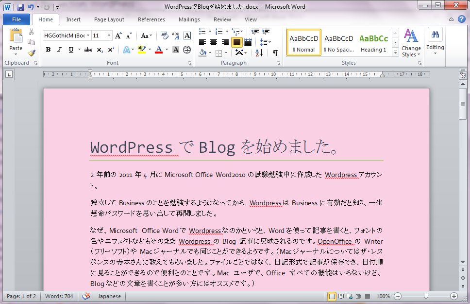 私はもちろん、MS Office Word 2010を使って書いています。Microsoft認定インストラクターですからねー。一応。